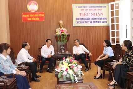 Lãnh đạo Ủy ban MTTQ Việt Nam thành phố Đà Nẵng tiếp nhận và trao đổi cùng đoàn công tác phường Cẩm Lệ trong buổi trao hỗ trợ.