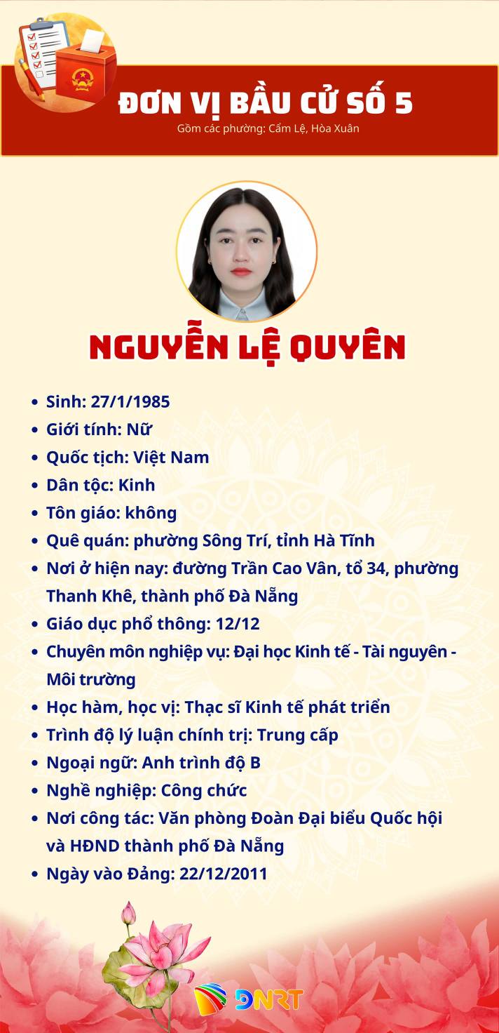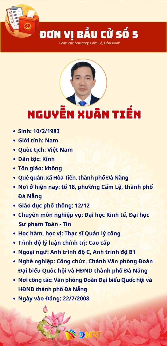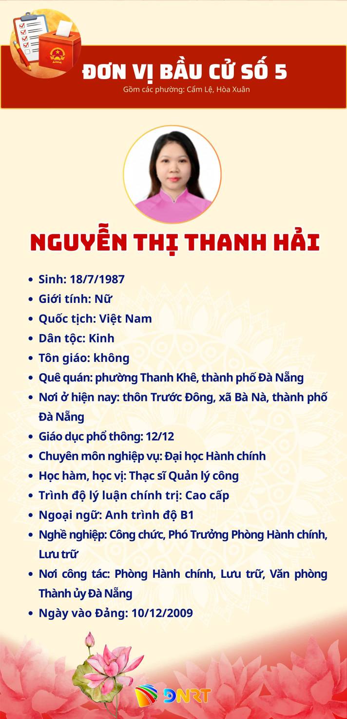 DANH SÁCH NHỮNG NGƯỜI ỨNG CỬ ĐẠI BIỂU HĐND THÀNH PHỐ ĐÀ NẴNG KHÓA XI, NHIỆM KỲ 2026 - 2031 (ĐƠN VỊ BẦU CỬ SỐ 5) Gồm các phường: Cẩm Lệ, Hòa Xuân Số người ứng cử: 07 người Số đại biểu HĐND Thành phố được bầu: 04 người