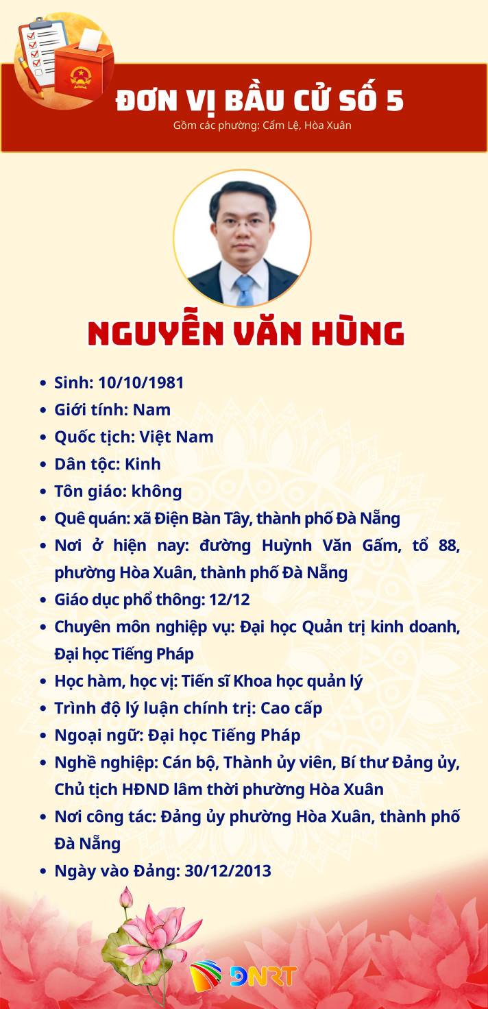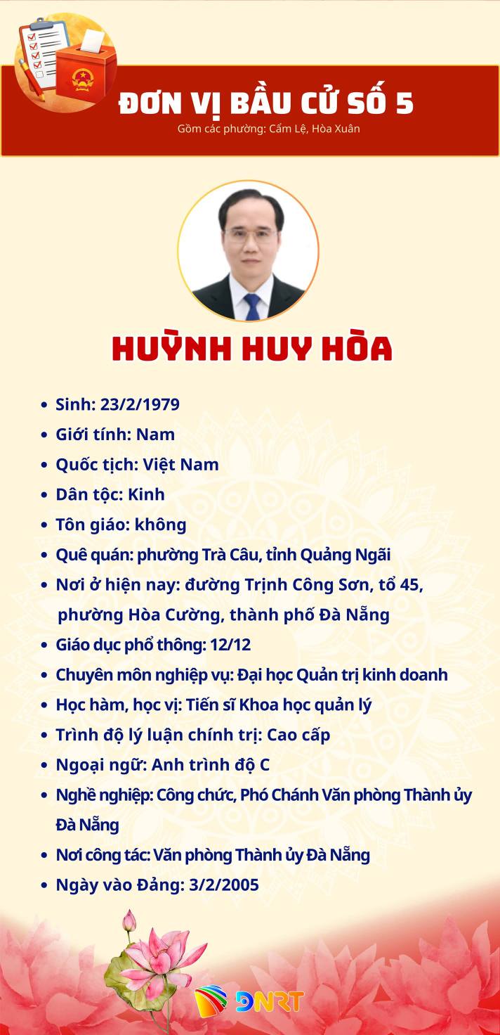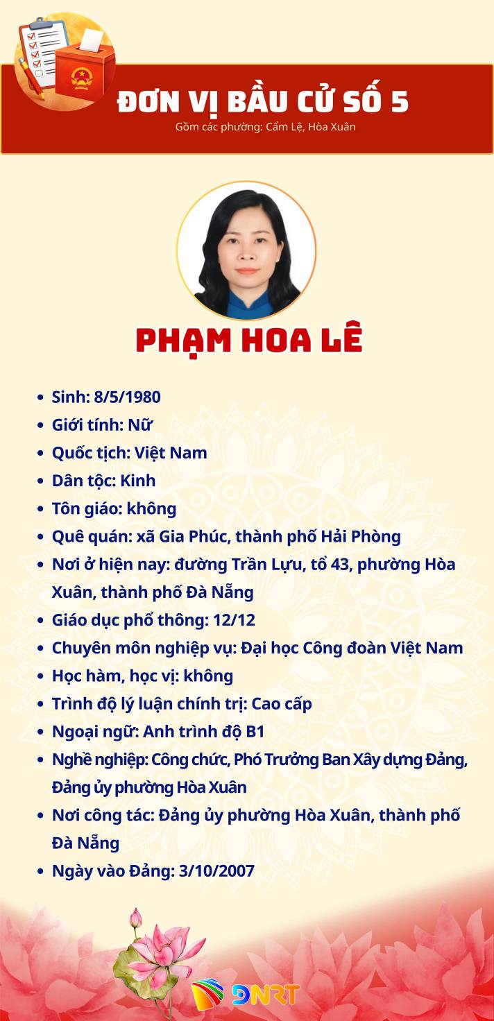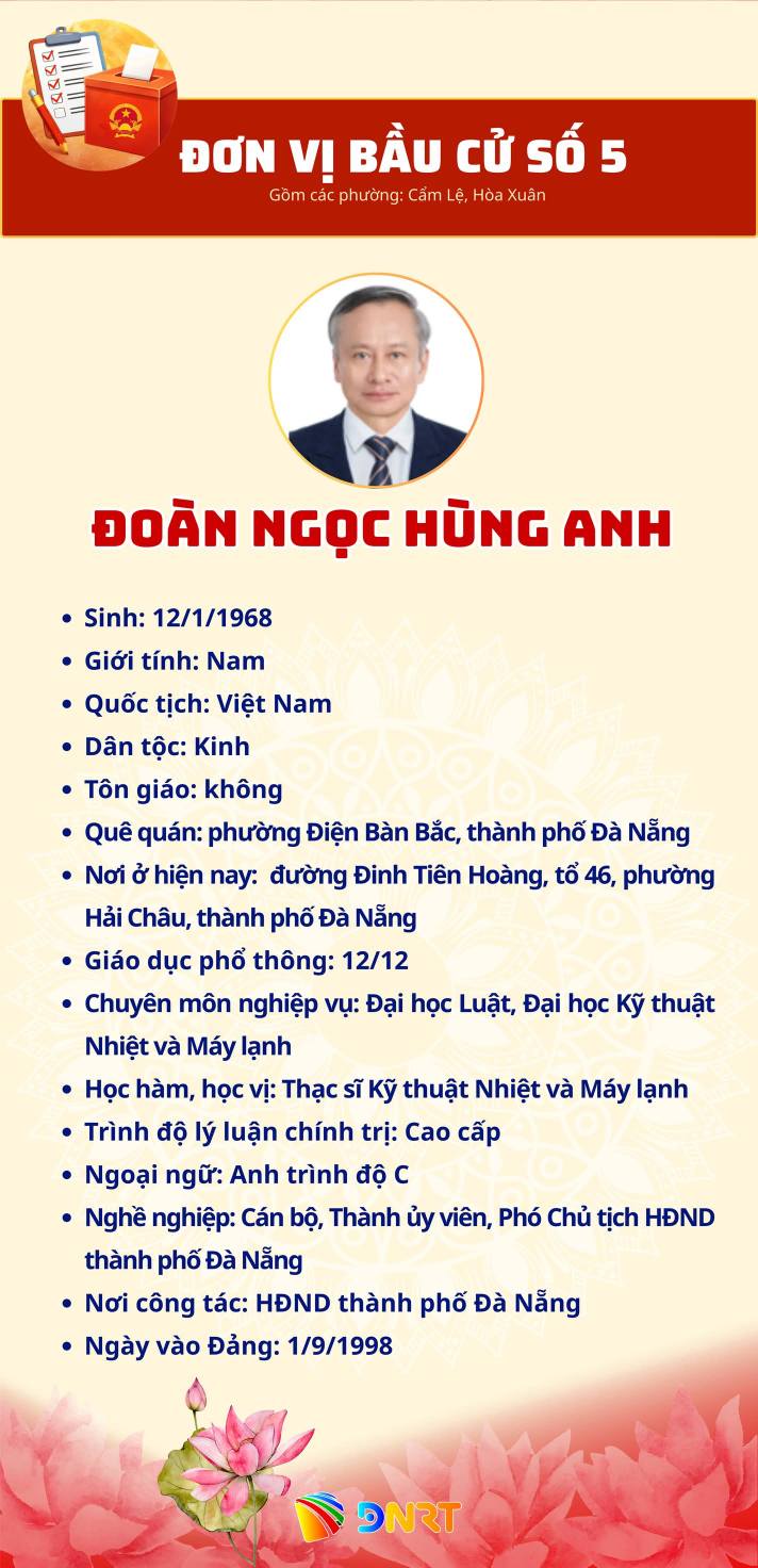 DANH SÁCH NHỮNG NGƯỜI ỨNG CỬ ĐẠI BIỂU HĐND THÀNH PHỐ ĐÀ NẴNG KHÓA XI, NHIỆM KỲ 2026 - 2031 (ĐƠN VỊ BẦU CỬ SỐ 5) Gồm các phường: Cẩm Lệ, Hòa Xuân Số người ứng cử: 07 người Số đại biểu HĐND Thành phố được bầu: 04 người