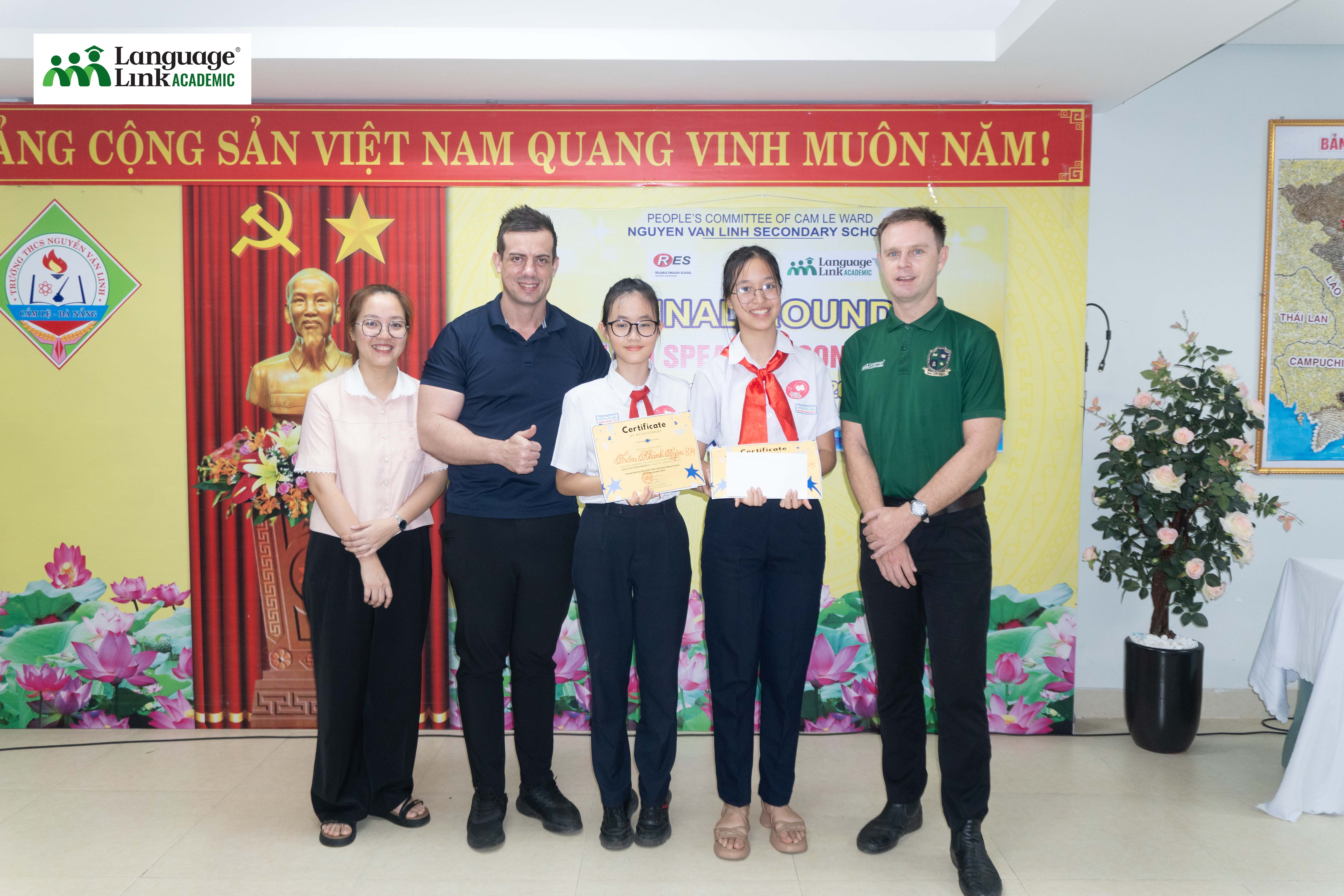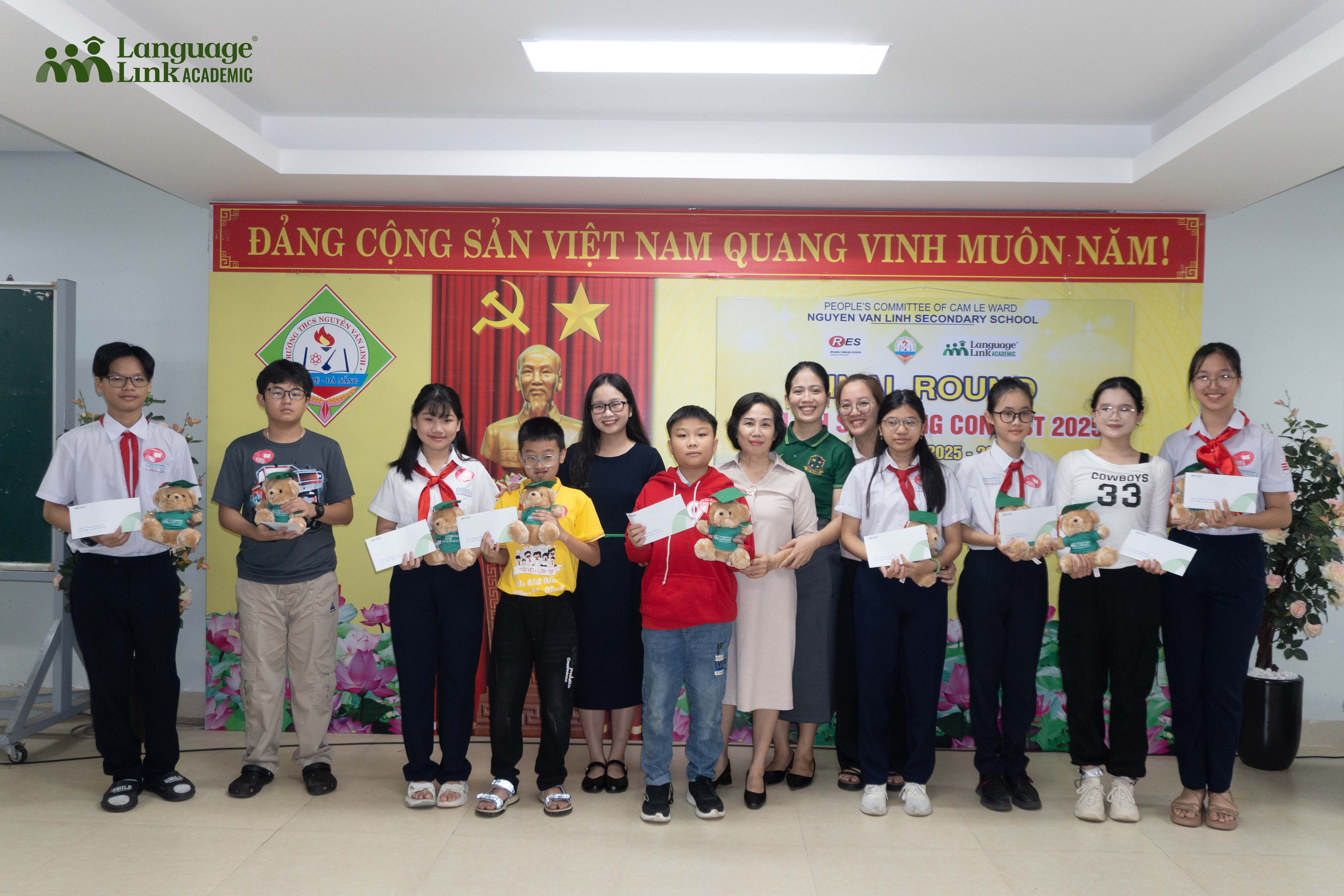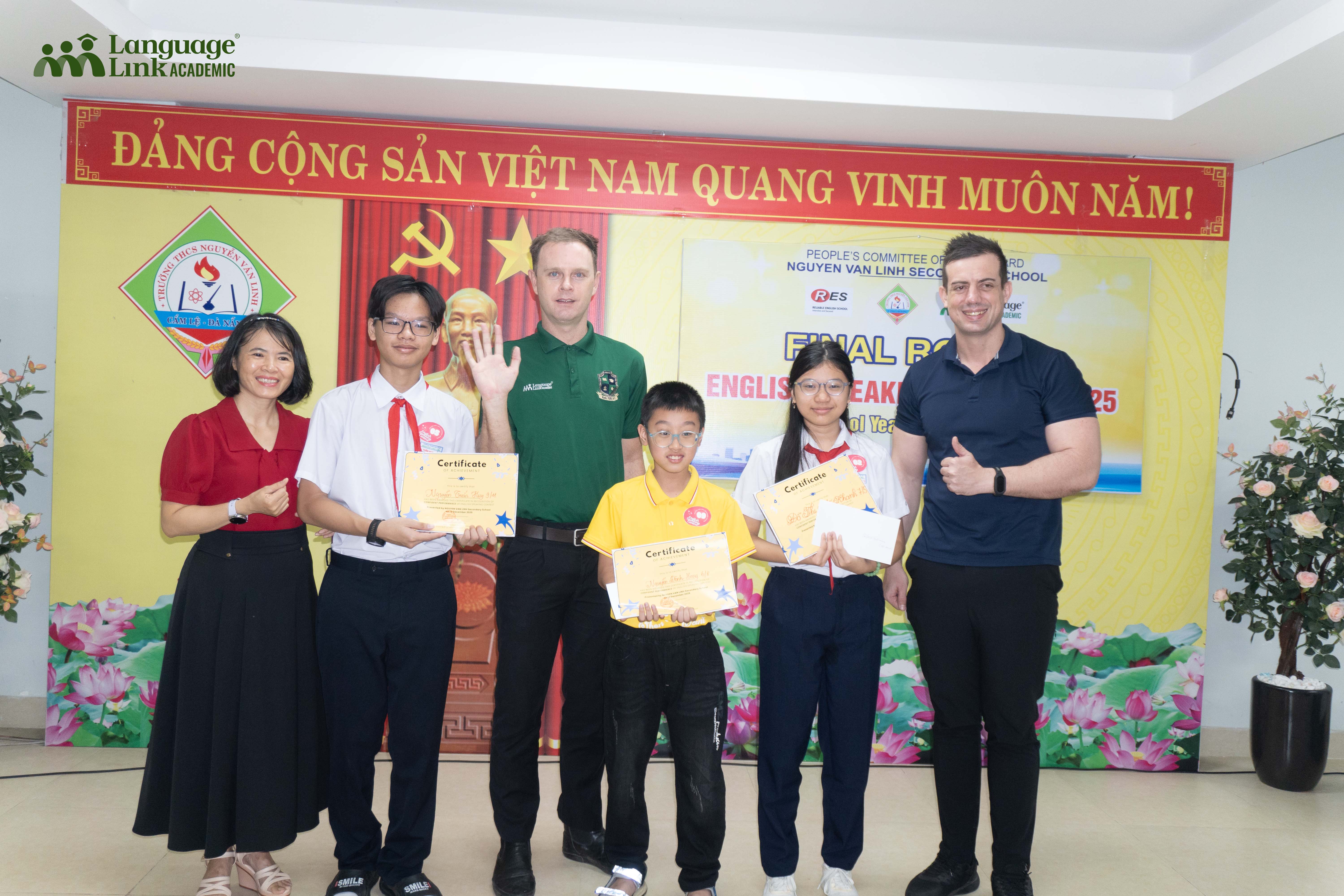 Đại diện Trung tâm Anh ngữ Language Link Academic, Trung tâm Anh ngữ RES và BGH trường THCS Nguyễn Văn Linh trao giải cho các em học sinh