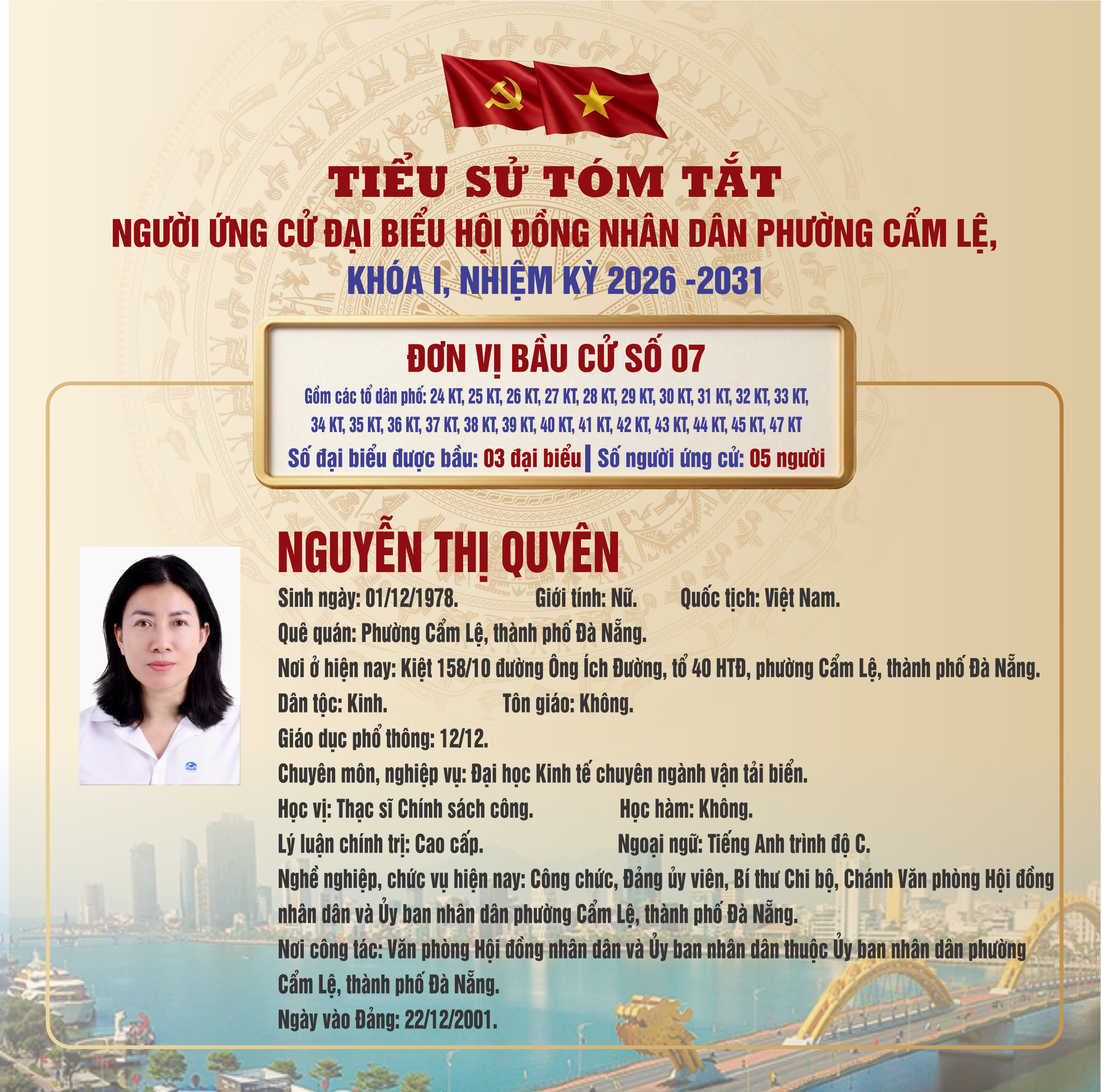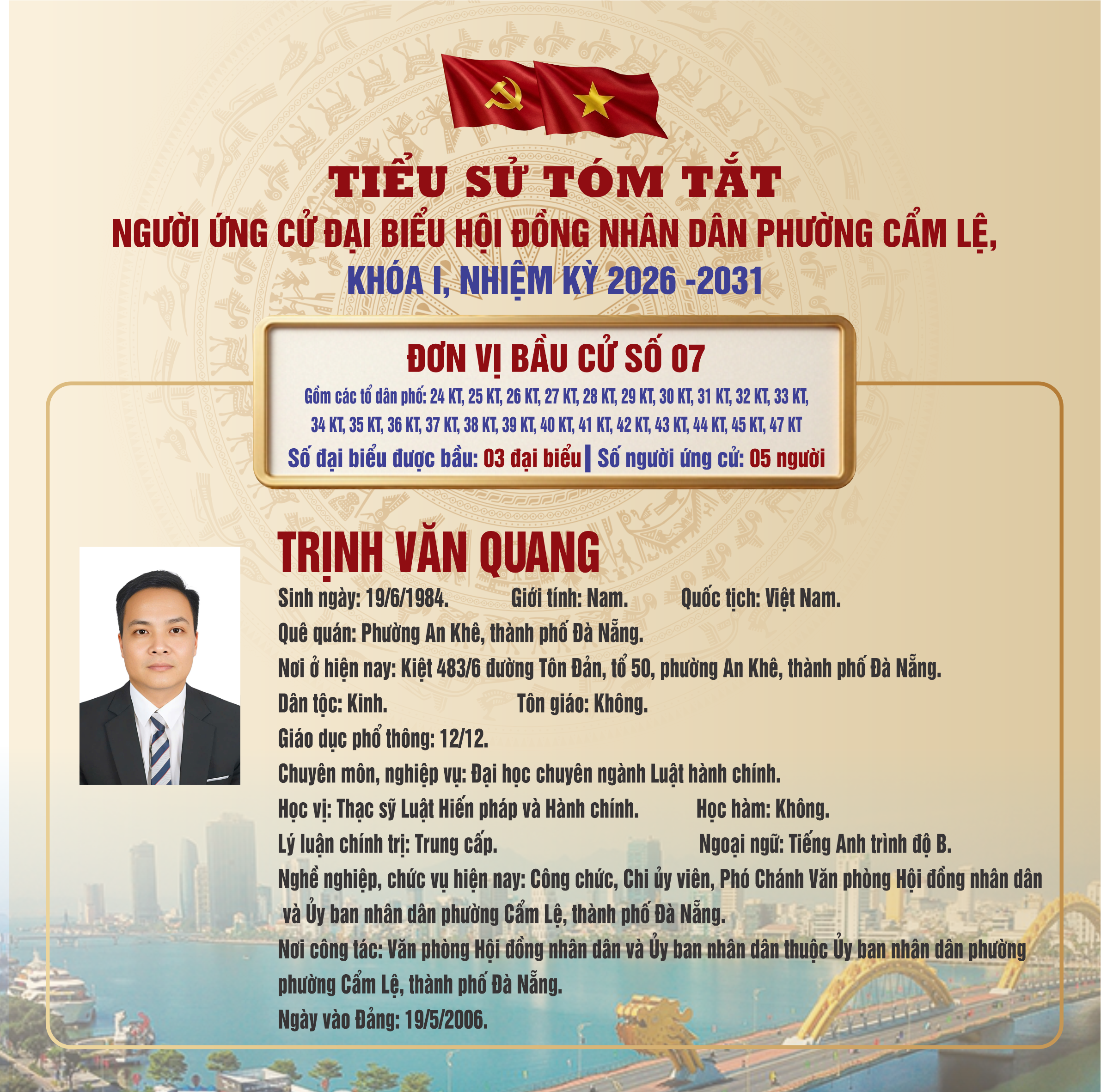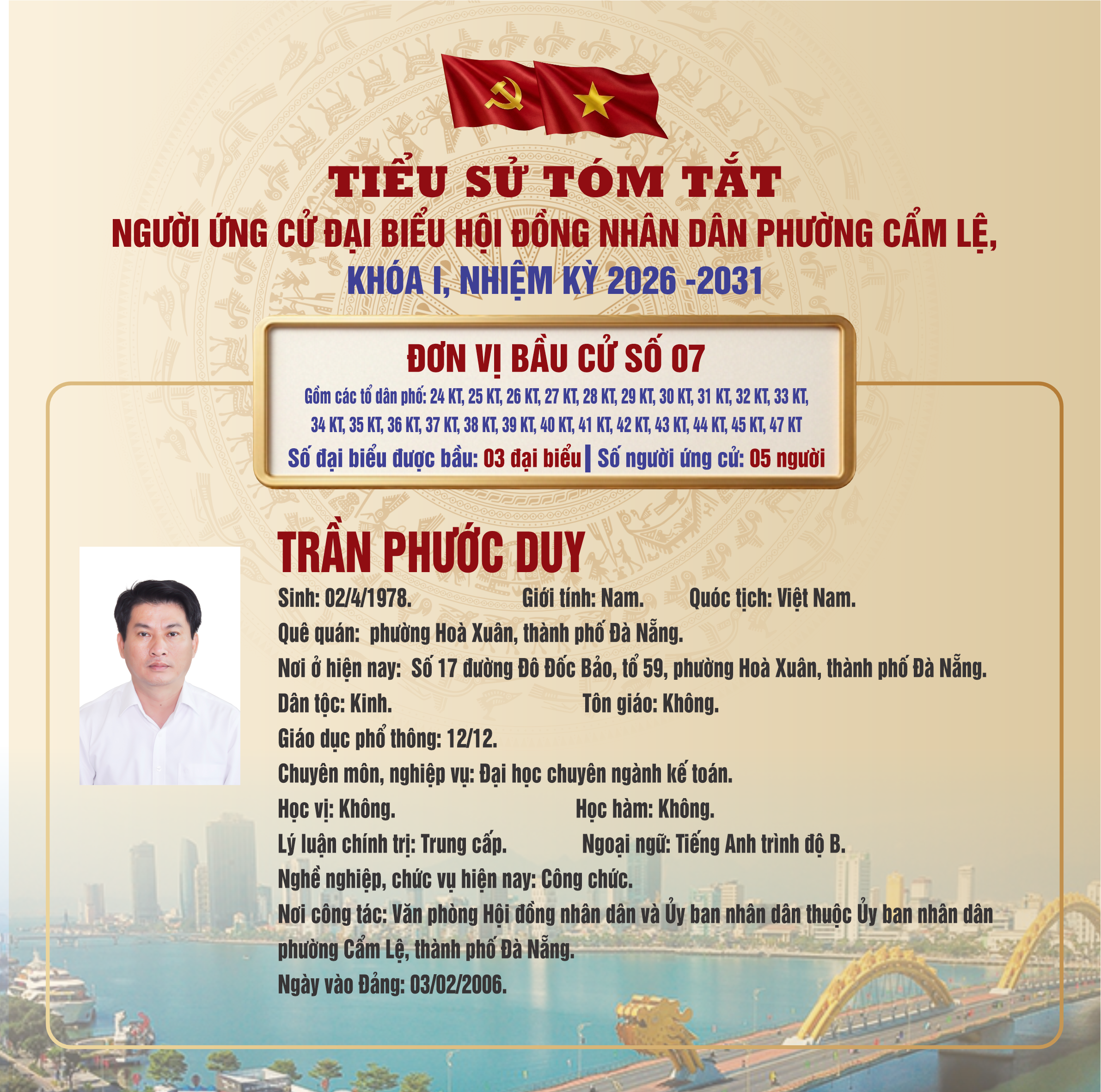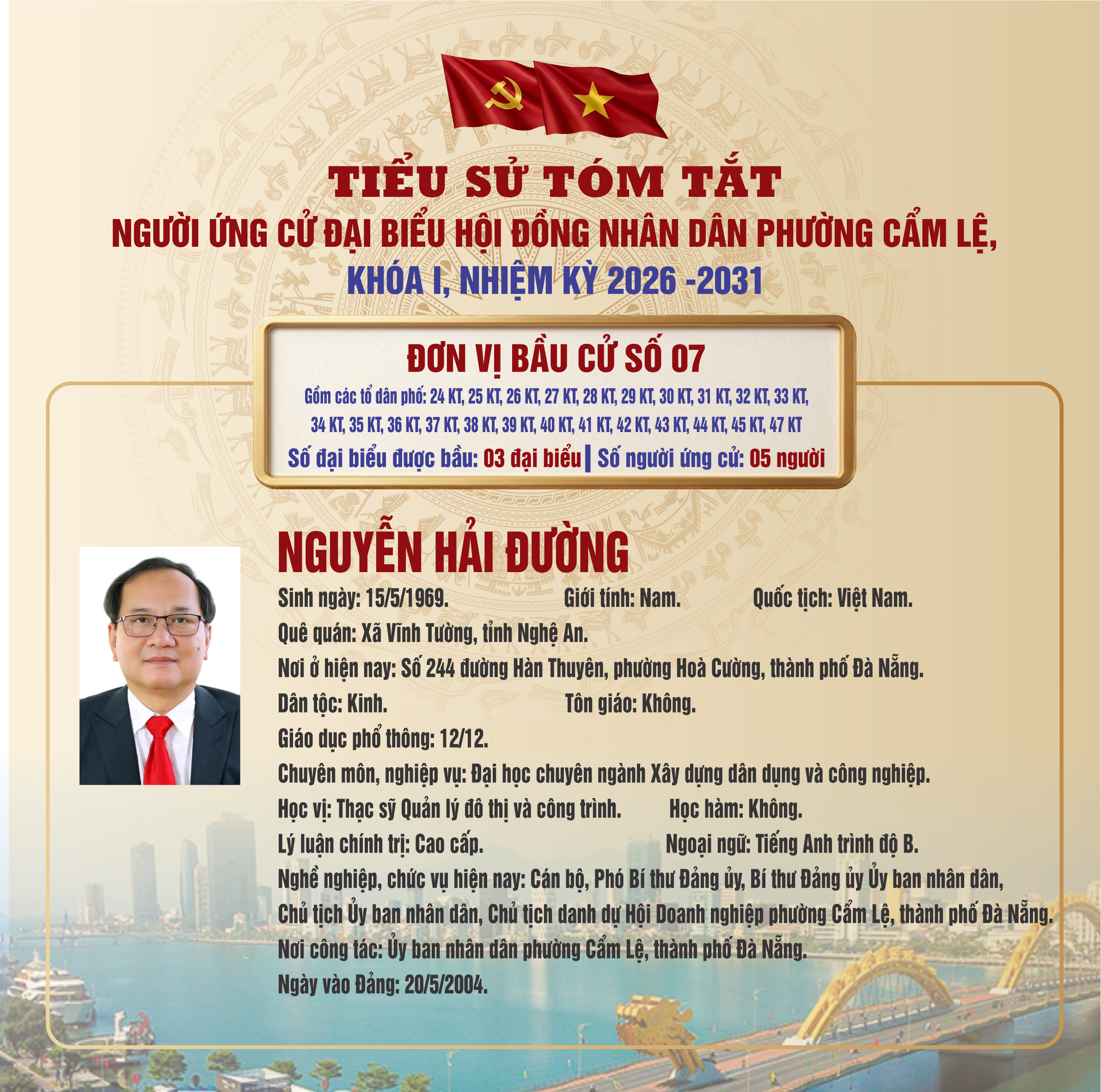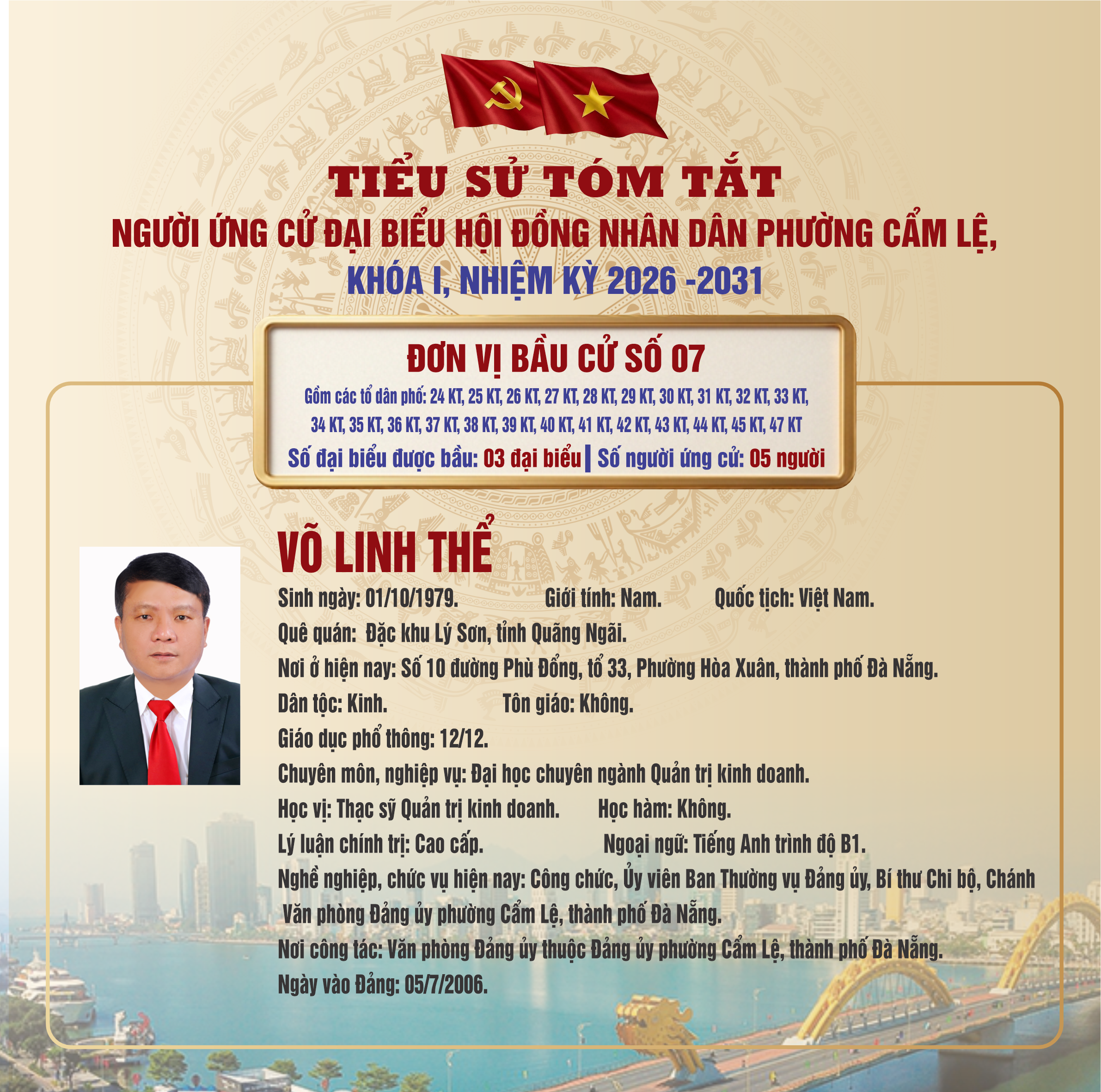 TIỂU SỬ TÓM TẮT CỦA NGƯỜI ỨNG CỬ ĐẠI BIỂU HỘI ĐỒNG NHÂN DÂN PHƯỜNG CẨM LỆ KHÓA I, NHIỆM KỲ 2026 - 2031 TẠI ĐƠN VỊ BẦU CỬ SỐ 07 (GỒM CÁC TỔ DÂN PHỐ: 24KT, 25KT, 26KT, 27KT, 28KT, 29KT, 30KT, 31KT, 32KT, 33KT, 34KT, 35KT, 36KT, 37KT, 38KT, 39KT, 40KT, 41KT, 42KT, 43KT, 44KT, 45KT, 47KT).