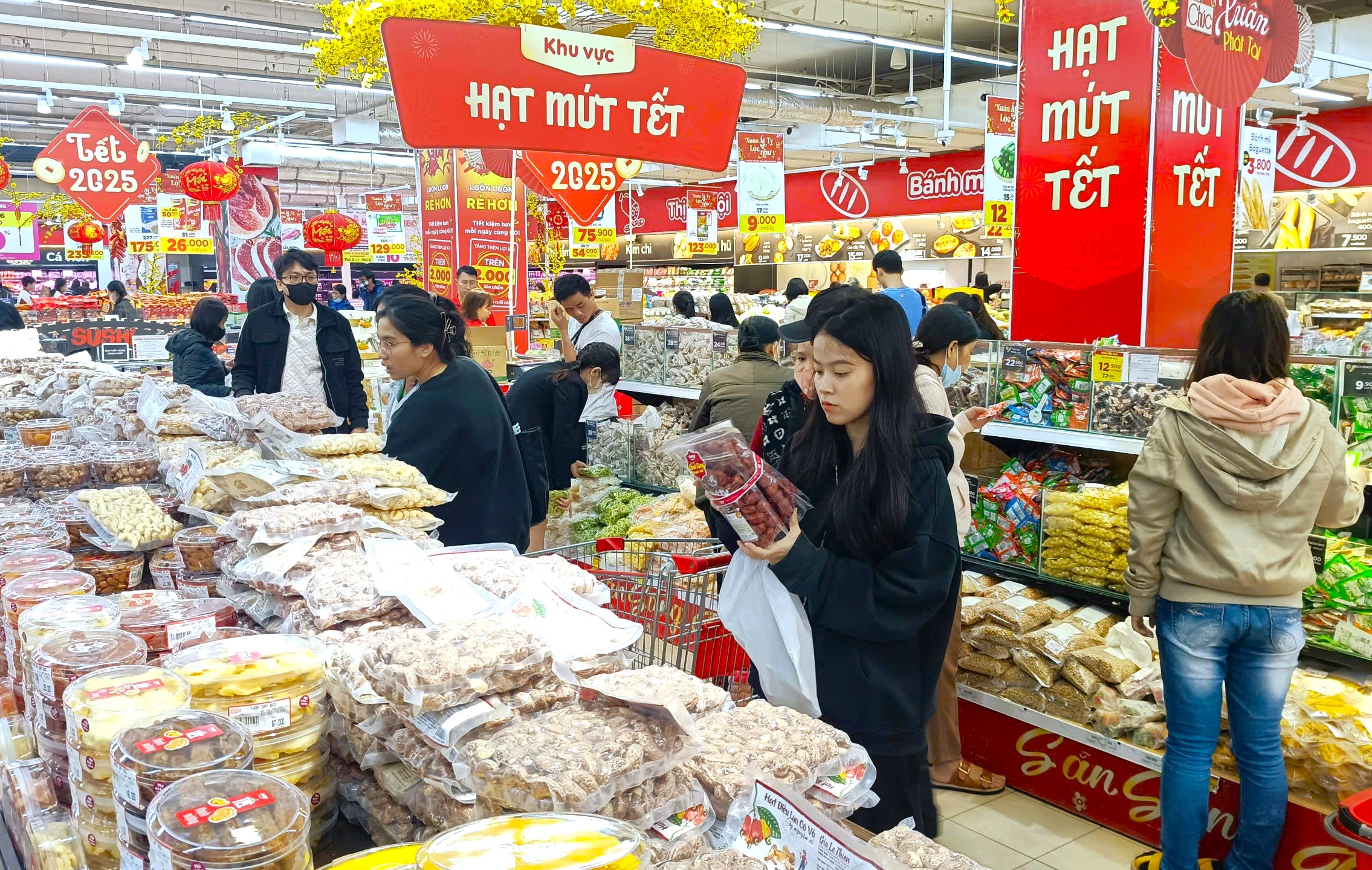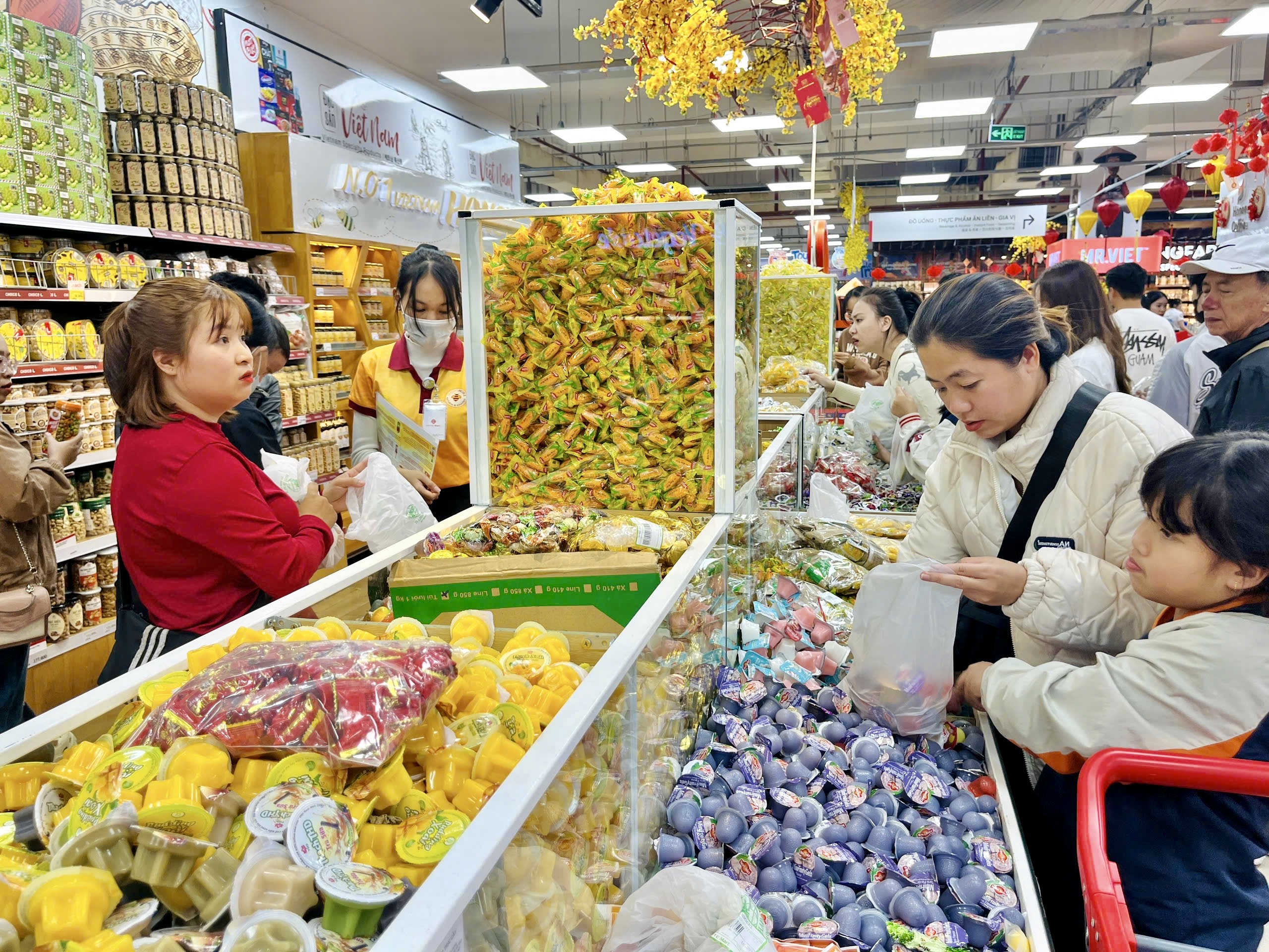 Những ngày cuối năm, không gian mua sắm tại các siêu thị trở nên nhộn nhịp hơn bao giờ hết khi Tết Nguyên Đán đang cận kề. Sắc xuân tràn ngập khắp nơi với các mặt hàng Tết được bày biện rực rỡ và đa dạng. Từ bánh kẹo, nước ngọt đến đặc sản vùng miền đóng gói, tất cả đều sẵn sàng đáp ứng nhu cầu của người tiêu dùng, để chuẩn bị cho một cái Tết trọn vẹn và ấm áp.