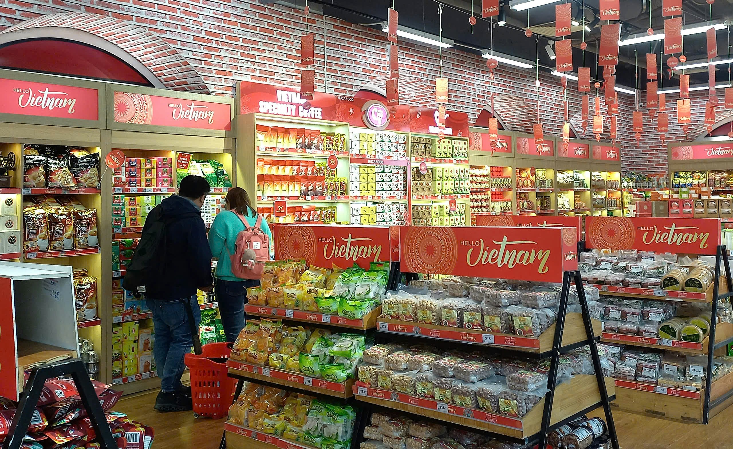 Tại siêu thị WinMart năm nay lại có thêm điểm nhấn nổi bật là “Khu chợ Tết” – không gian mua sắm được thiết kế riêng để tạo không khí rộn ràng cho mùa xuân. Khu vực này được bài trí bắt mắt với các sản phẩm đặc trưng ngày Tết như bia, nước giải khát, trà, và các loại bánh hộp. Sự đa dạng và phong phú của các mặt hàng tại đây không chỉ thu hút người tiêu dùng địa phương mà còn làm hài lòng khách du lịch đến mua sắm.