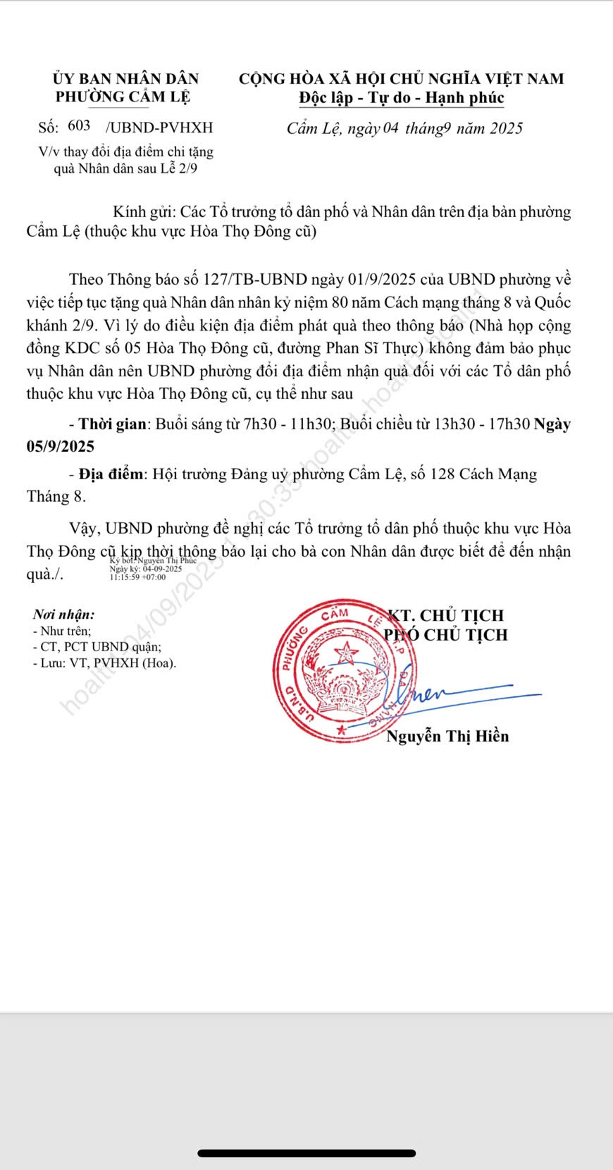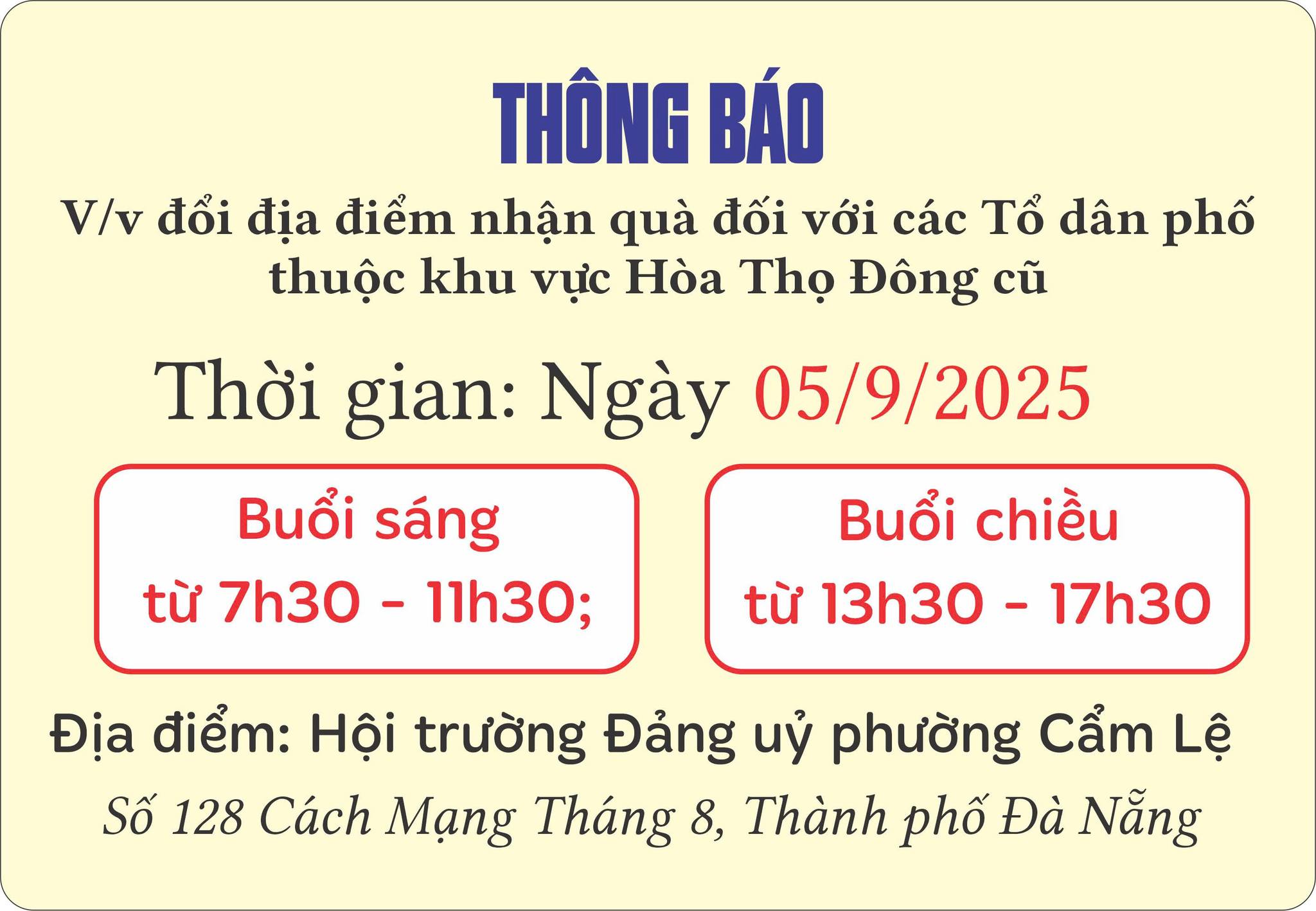 Thông báo: Về việc thay đổi địa điểm chi tặng quà cho người dân sau lễ Quốc khánh 02/9 trên địa bàn phường Cẩm Lệ