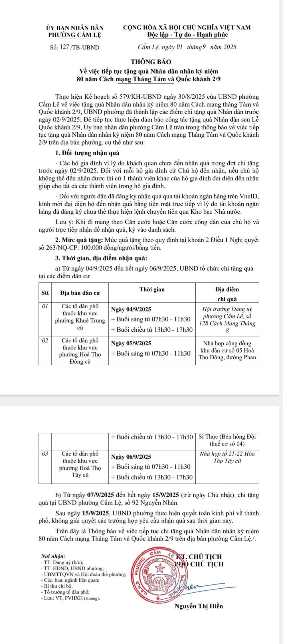 Thông báo về việc tiếp tục tặng quà nhân dân nhân kỷ niệm 80 năm Cách mạng tháng 8 và Quốc khánh 02/9 trên địa bàn phường Cẩm Lệ